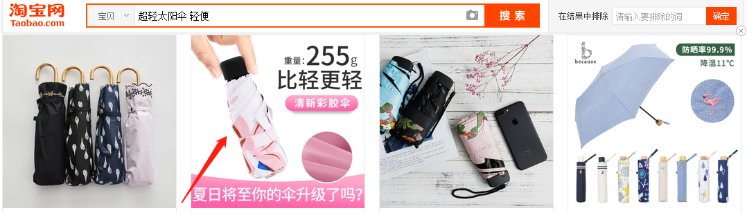 买家对于我们宝贝的第一印象是来自于我们的主图,因此主图并不是越美观越大气越好,而是要与你的主关键词(也就是进店大流量词)相一致。买家的搜索关键词,就意味着他在寻找什么,那么我们要是在主图上表达出买家正需要寻找的东西,直击买家的痛点,图片点击率是不是会很高。比如说买家想要的是“超轻太阳伞 轻便”,那么你的主图是不是就可以突出他的重量,以及方便,才能让买家点击浏览并促成购买?